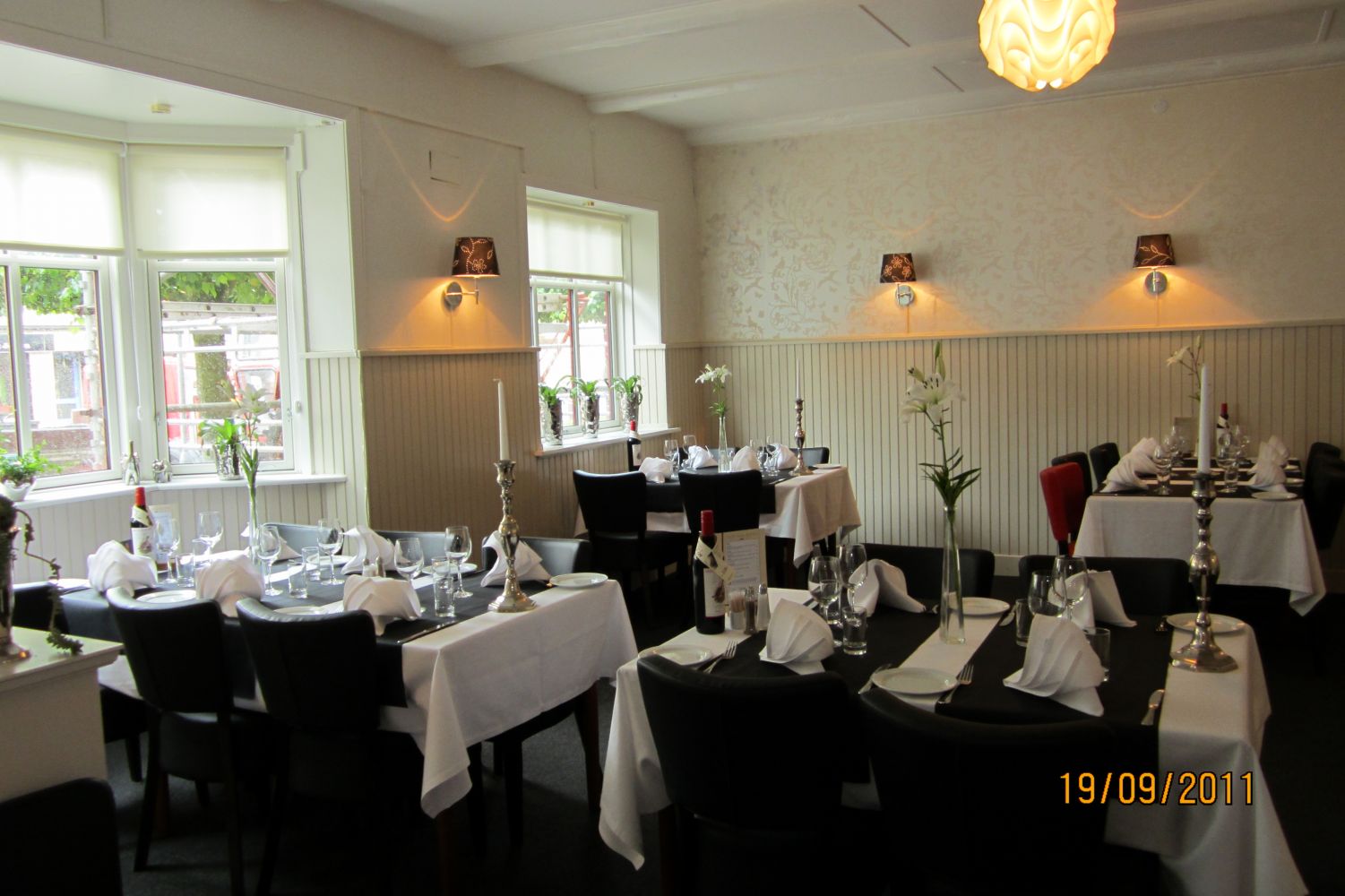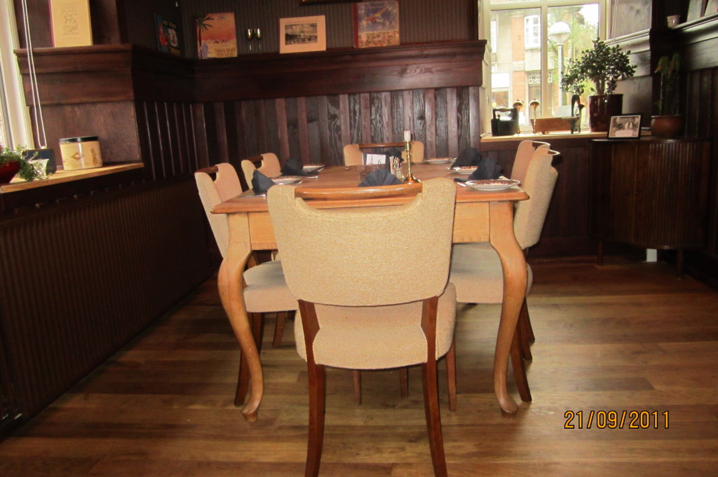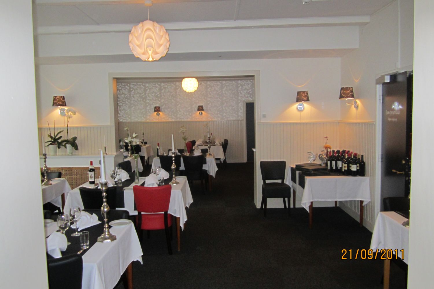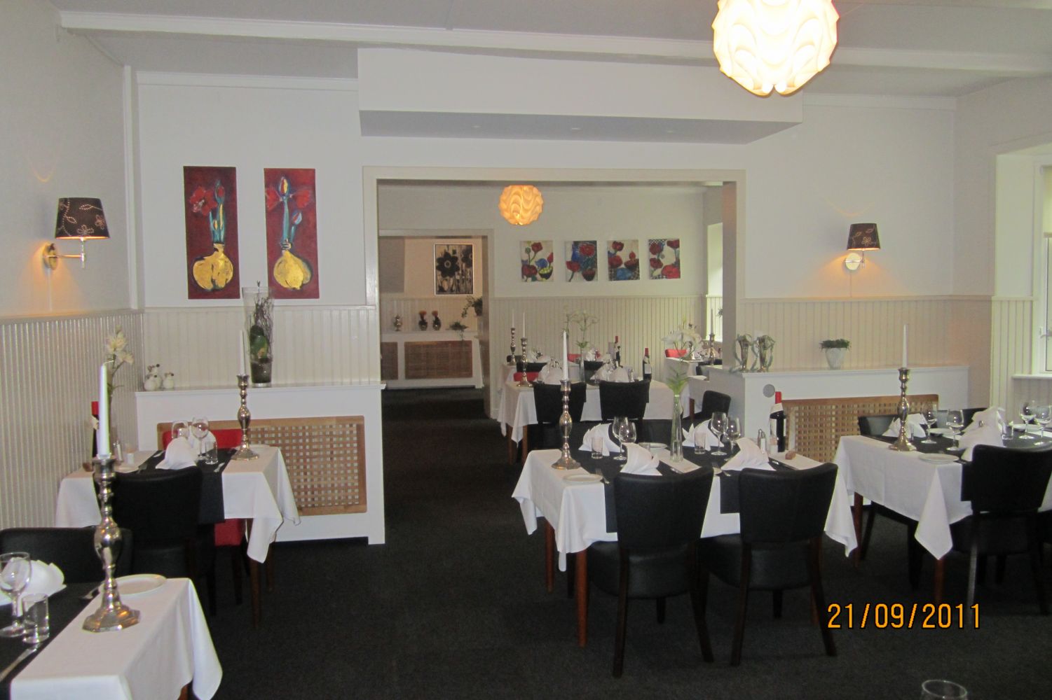 Restauranten med den lyse eksklusive indretning og de gedigne kvalitetsmøbler, er den perfekte ramme om en dejlig aften i smukke omgivelser. Restauranten er ny og moderne. Her har vores gæster selv deres underholdning med. Her bliver indgået aftaler og diskussioner bliver afrundet. Her vil man ikke forstyrres af indtryk og uro. Her tales dæmpet og fortroligt. Restauranten er enkel i sin fremtoning, men har dog kant i forme af de røde stole og billeder. Mangler man lige noget at starte samtalen på, er billederne glimrende til formålet.